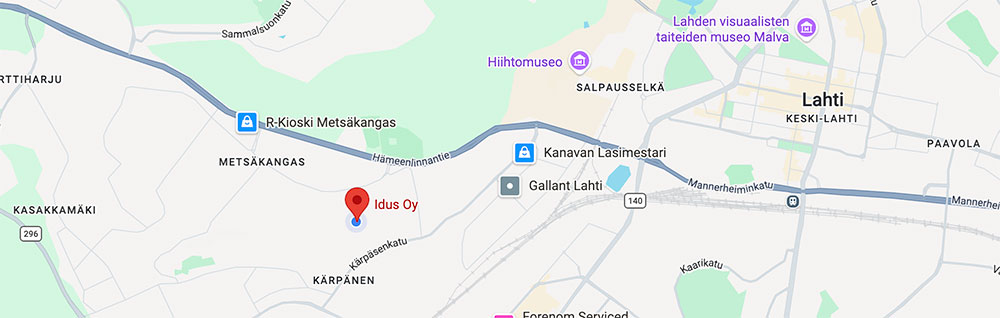 Idus Oy Idus Oy Palokunnatie 19 15800 Lahti, FinlandAjo-ohjeet +358 (0)44 339 6579 info(ä)idus.fi www.idus.fi Andreja ValtanenCreative Director, MA+358 (0)44 339 6579info(ä)idus.fi Juha Valtaneninfo(ä)idus.fi Avaa kartta